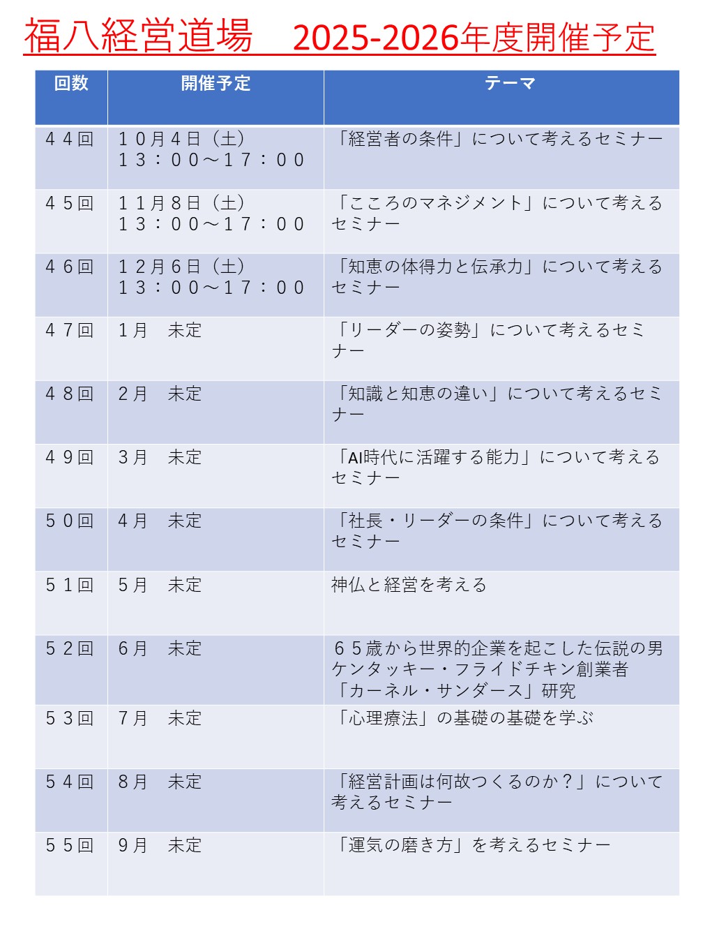 第43回福八経営道場は、9月6日(土)13時~17時で、新子安のビューポリスで開催します。テーマは「経営者の条件」について考えるです。参加を希望される方は、下記メールまで申し込みください。