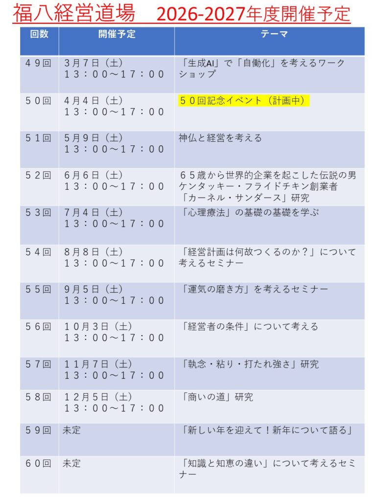 第48回福八経営道場は、2月7日(土)13時~17時で、新子安のビューポリスで開催します。前半に、「我が社の採用戦略」を参加全員に思う存分語っていただきます。後半は、福八パートナーコンサルタント・霜田眞先生より、「育成就労制度スタート(技能実習制度は実質終了)」のセミナーを開催します。2本とも飛躍的な成長を目指す会社の社長に、自社の経営について深く考える機会を提供いたします。